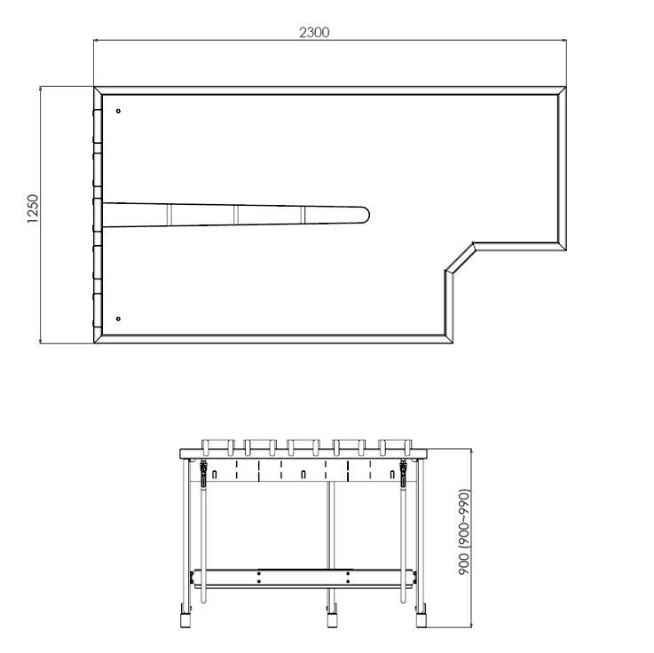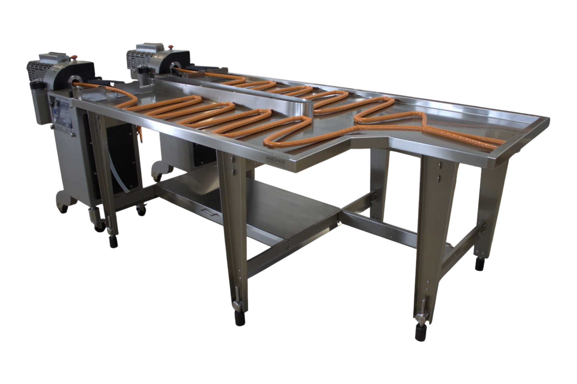 Mesa de embutir desmontable diseñada para optimizar el proceso de llenado y traslado de las tripas de forma ordenada y continua hacia la entrada de las atadoras ANDHER.